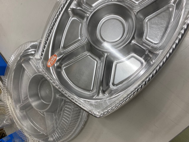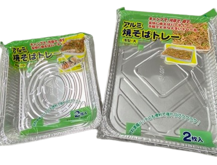 アルミ焼きそばトレーです。焦げ付かないし形も変えられて、使い捨て出来る。
